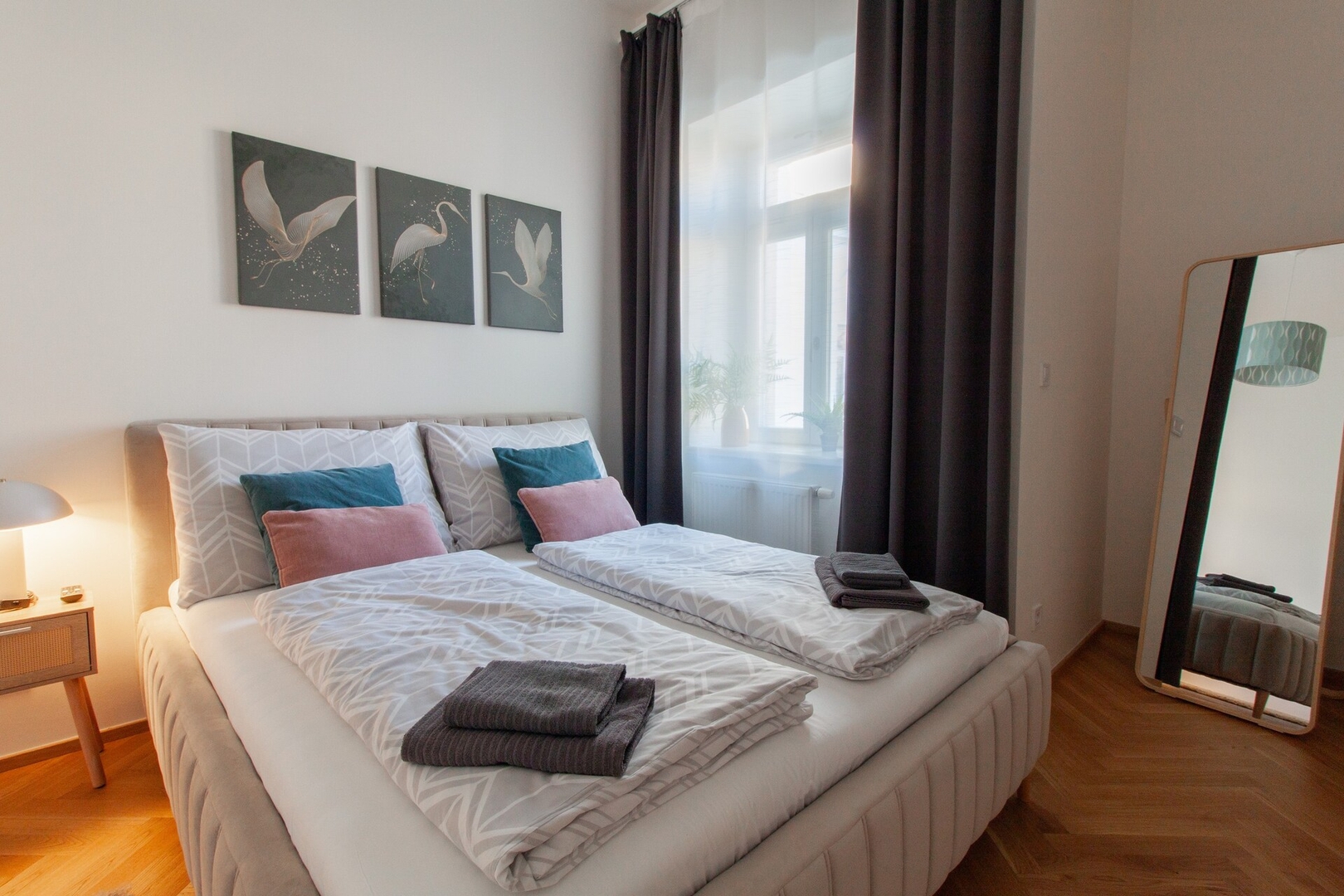 Wake up to soft light, sip coffee on your private balcony ?, and explore Prague’s charm hand in hand. ? Parking nearby: €25 (5 min), €20 (20 min). Garage (2.1m) on request. A cozy, stylish space just steps from the center. Book your escape today ?